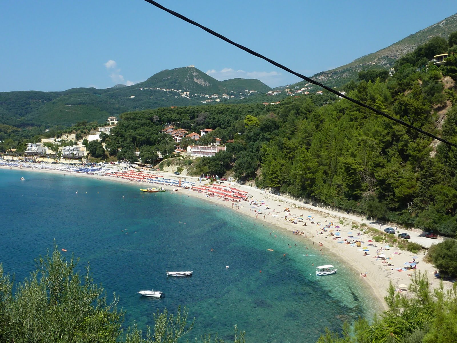 На плажа в Парга в никакъв случай не пропускайте таверната Flisvos, препоръчана ни от един немец. Няма начин да не я откриете, вижда се идеално от плажа, на склона до замъка. Страшно вкусно готвят, а чичото, който обслужва е голям майтапчия. Цените са нормални. Ето изглед към замъчето, Flisvos е почти скрита от клонките: